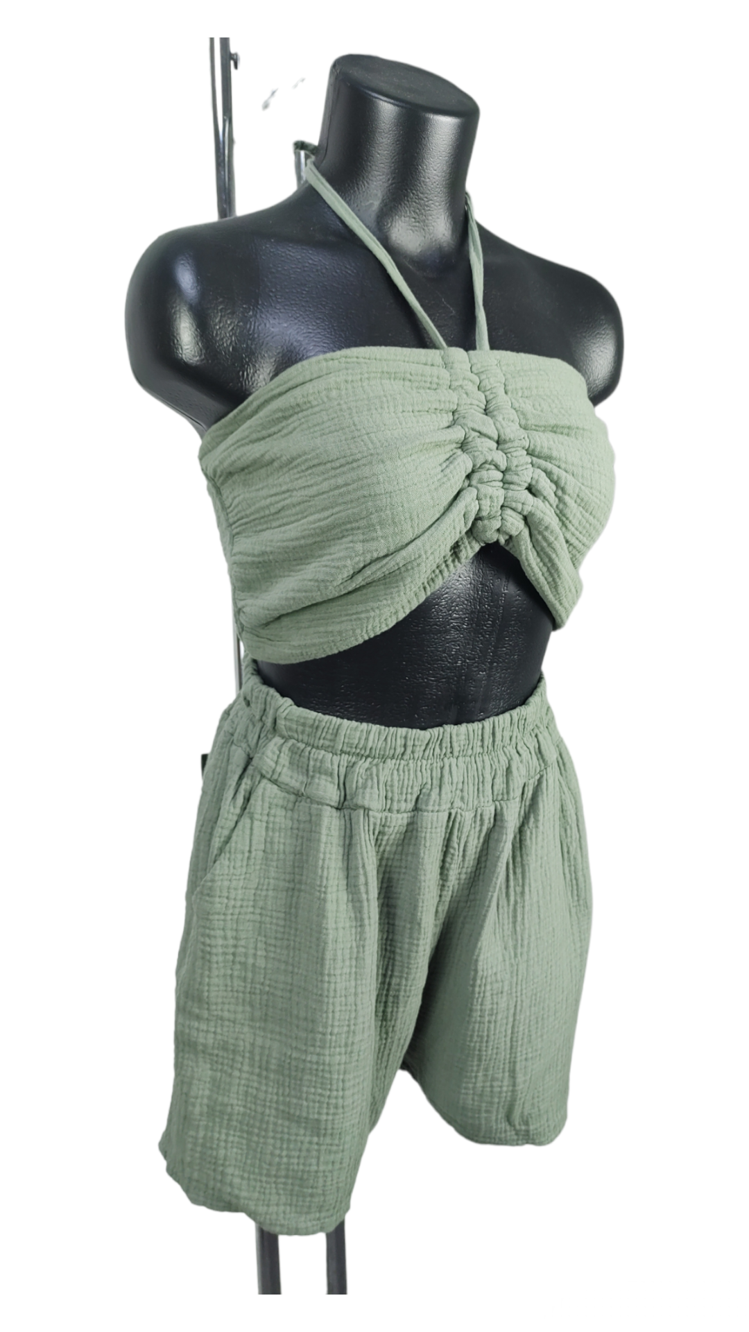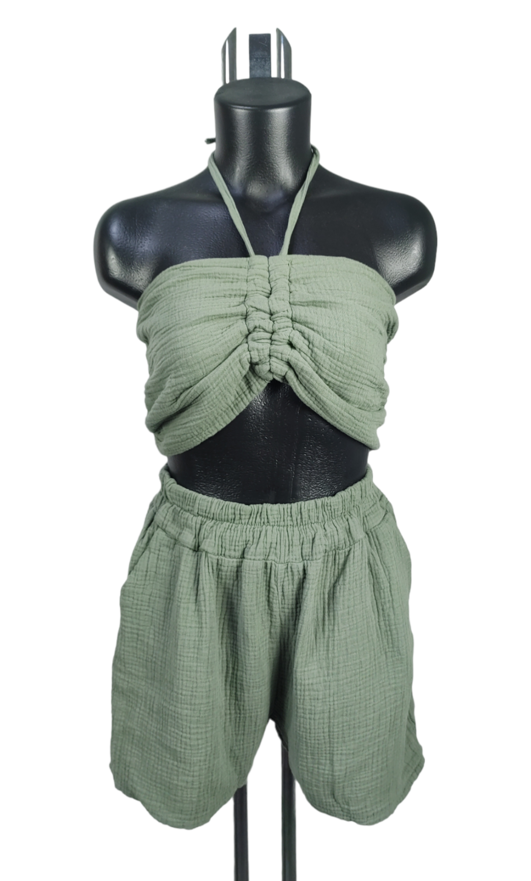 El top lleva goma en la espalda y el pantalón lleva goma en la cintura y bolsillos