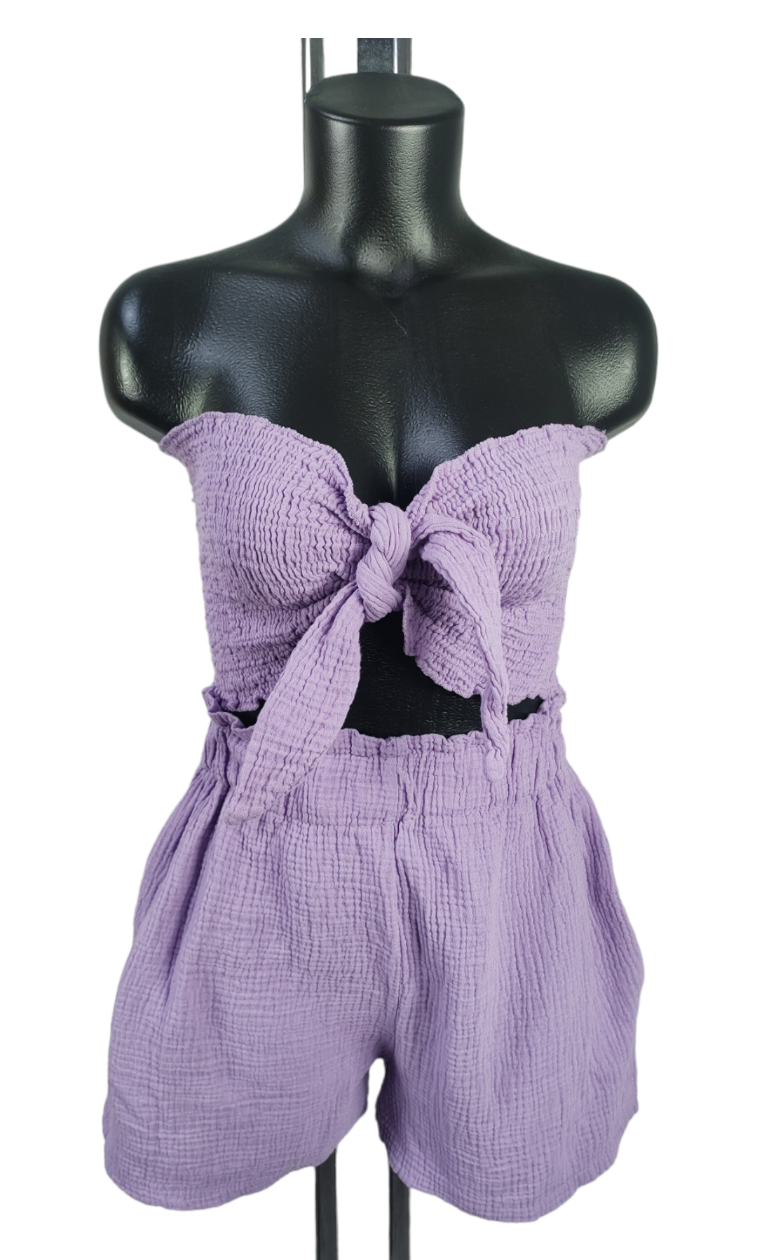 El top lleva goma en la espalda y el pantalón lleva goma en la cintura. El lazo del top va cosido. El pantalón lleva bolsillos