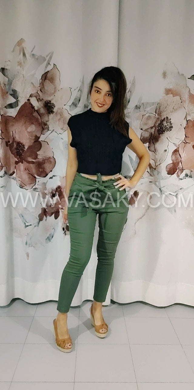 Pantalón elástico con cinturón (se le puede quitar). Tiene bolsillos laterales.