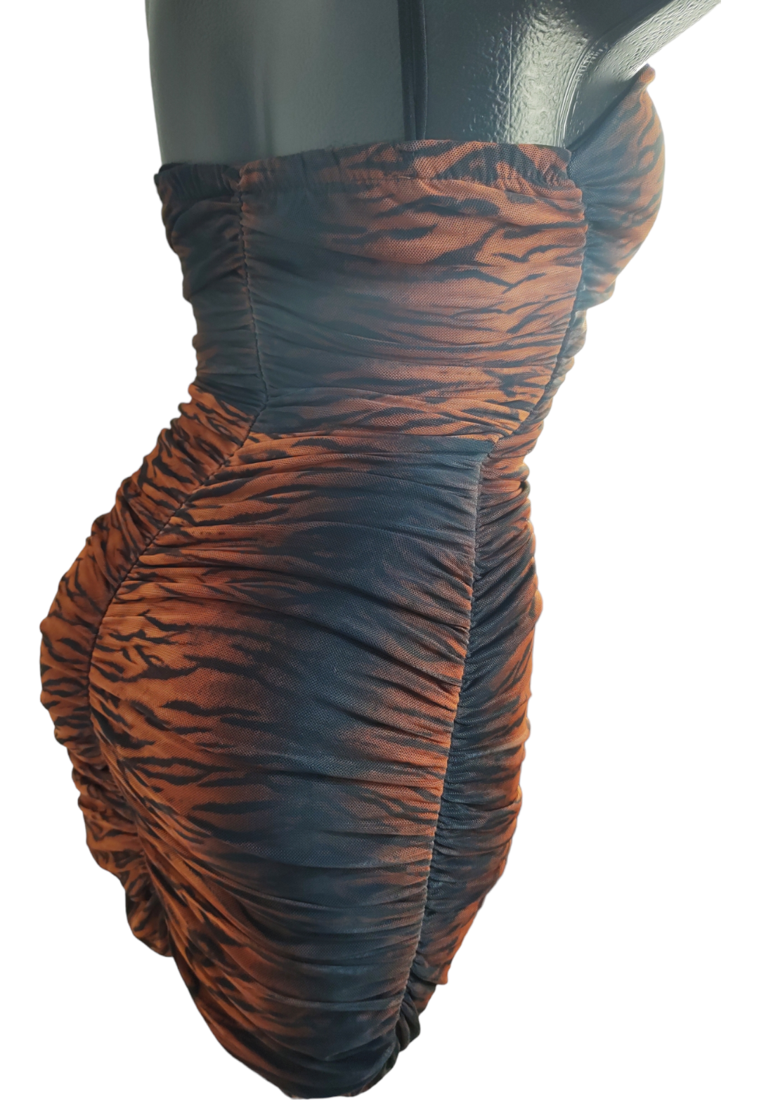 Lleva copas, una varilla en forma de V en la zona del escote. Los tirantes son de piedras de strass que se pueden quitar y poner cuando se quiera ya que lleva un pequeño broche. La parte trasera y los laterales van fruncidos.