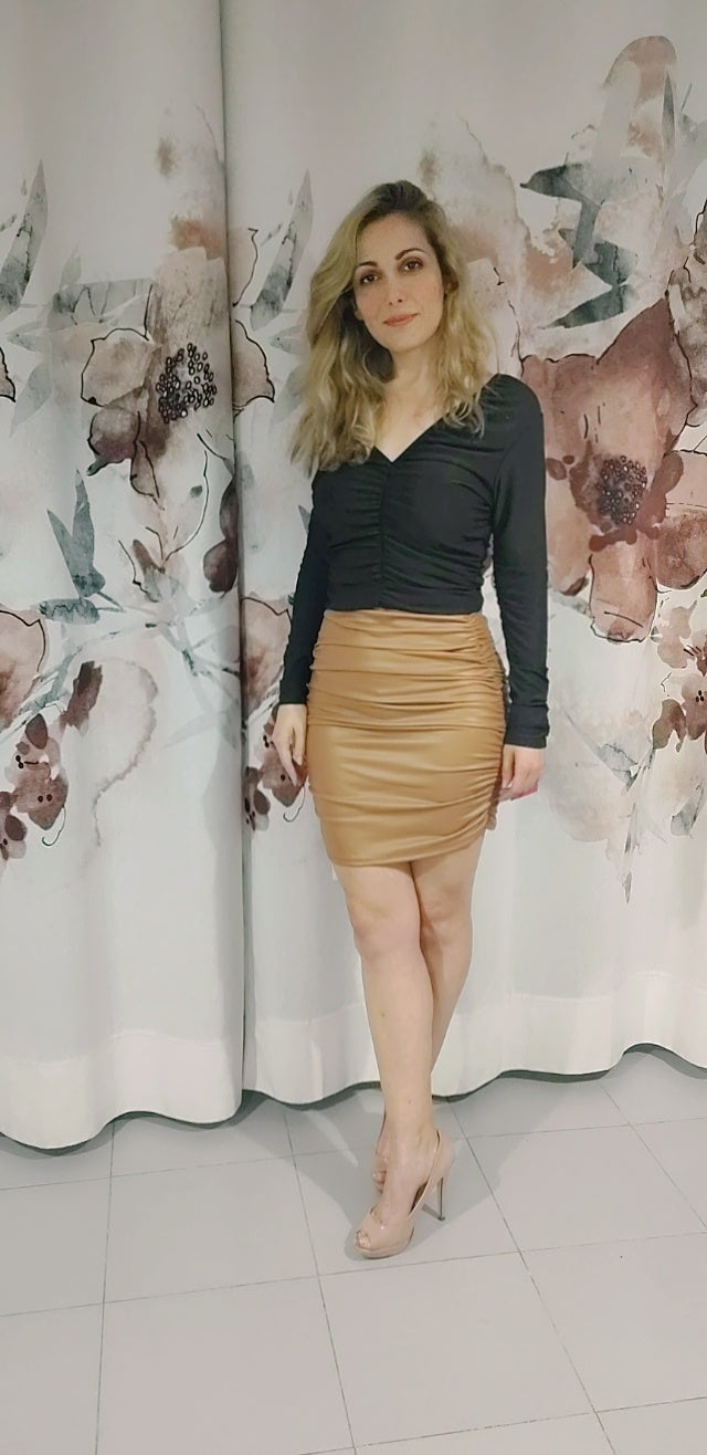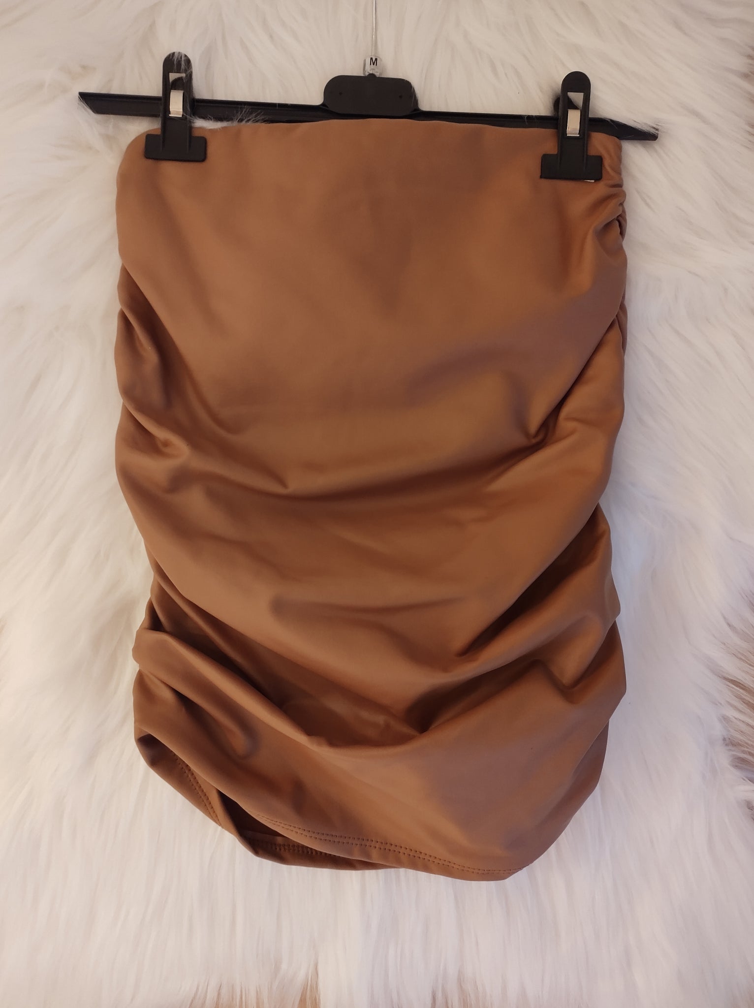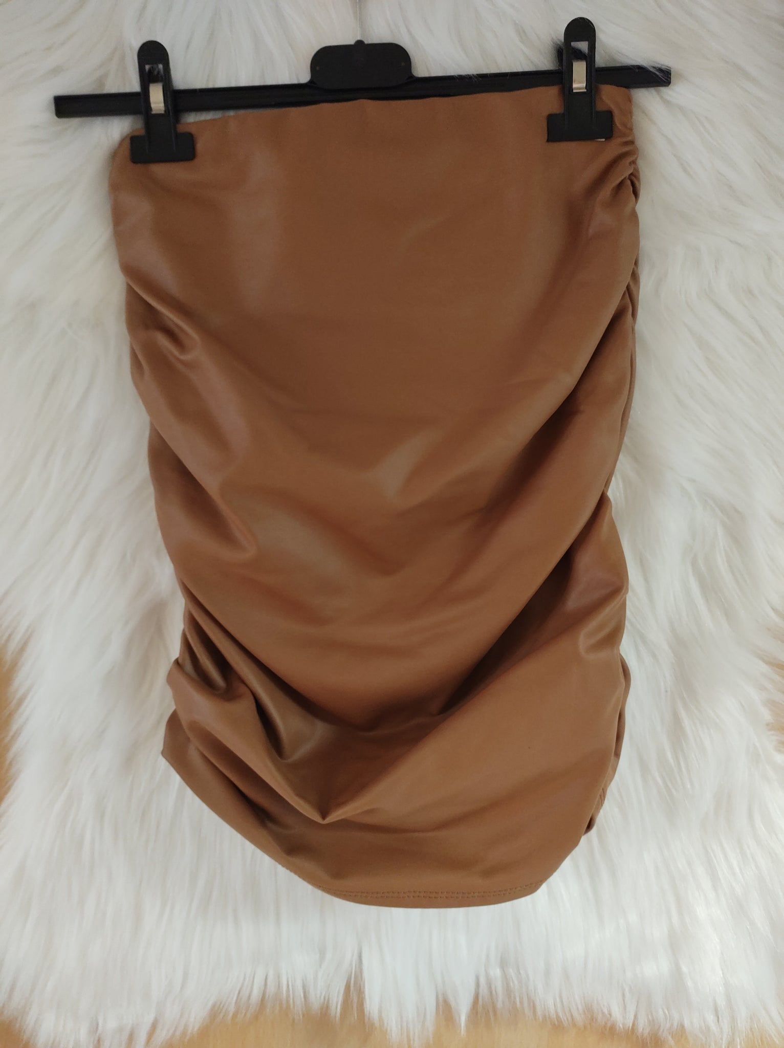 Falda de polipiel elástica con forro en la parte interna y fruncida en los laterales.