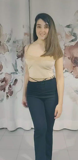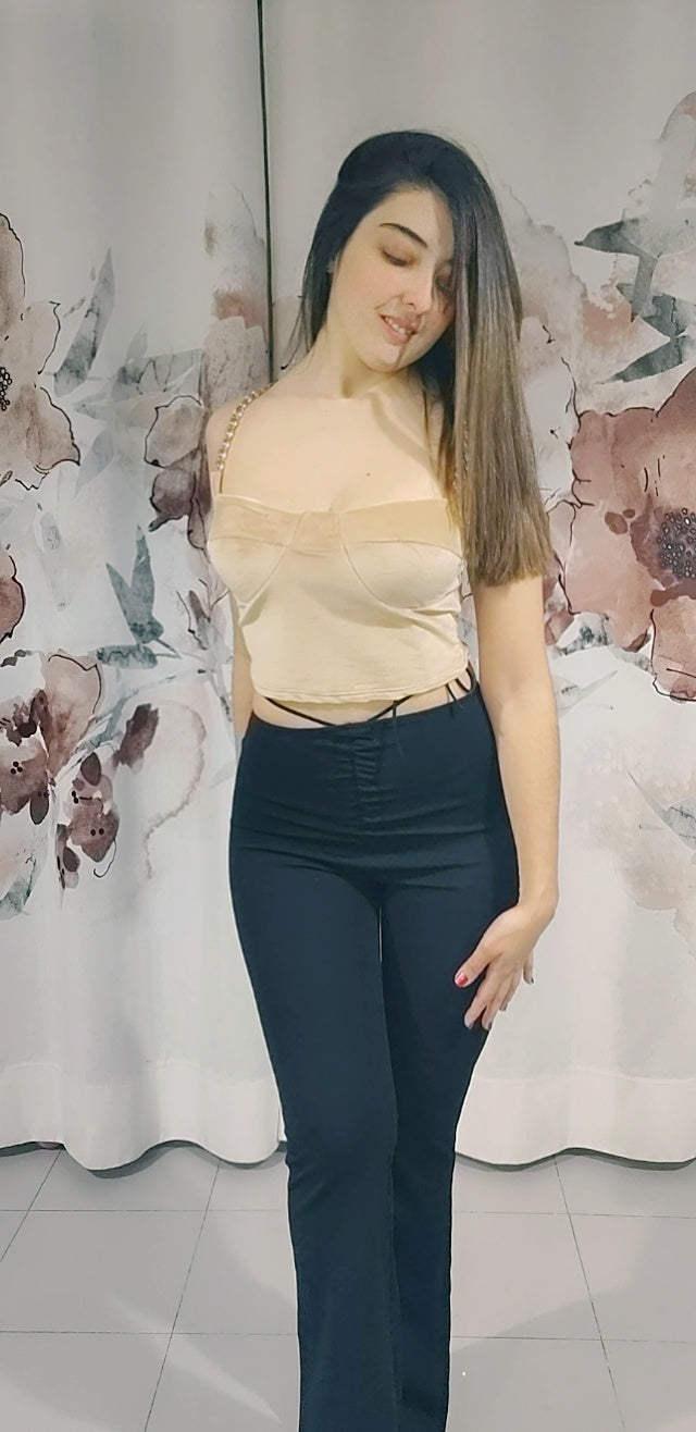 Top de terciopelo muy suave con copas incorporadas y cadenas en los tirantes no regulables.
