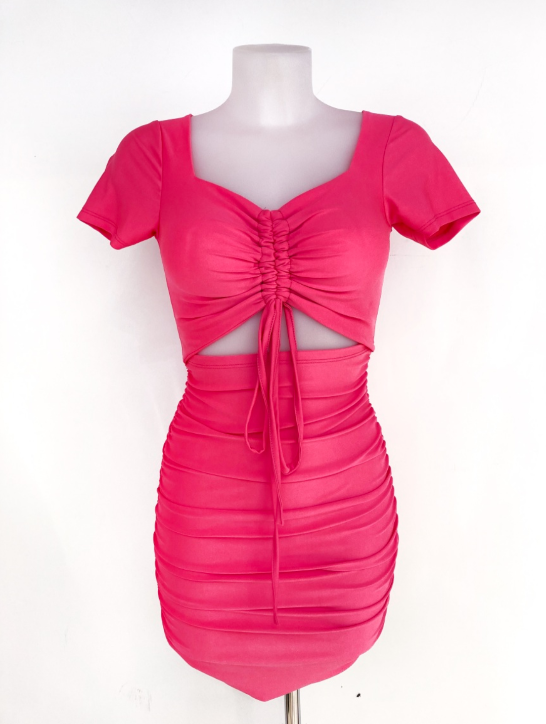 Vestido de lycra elástico. Fruncido por los laterales y copas incorporadas