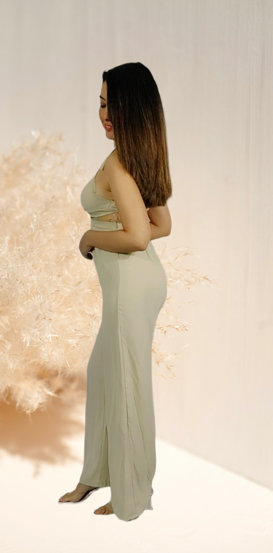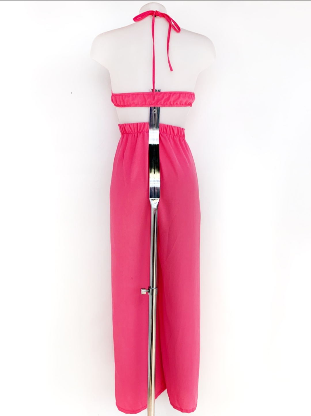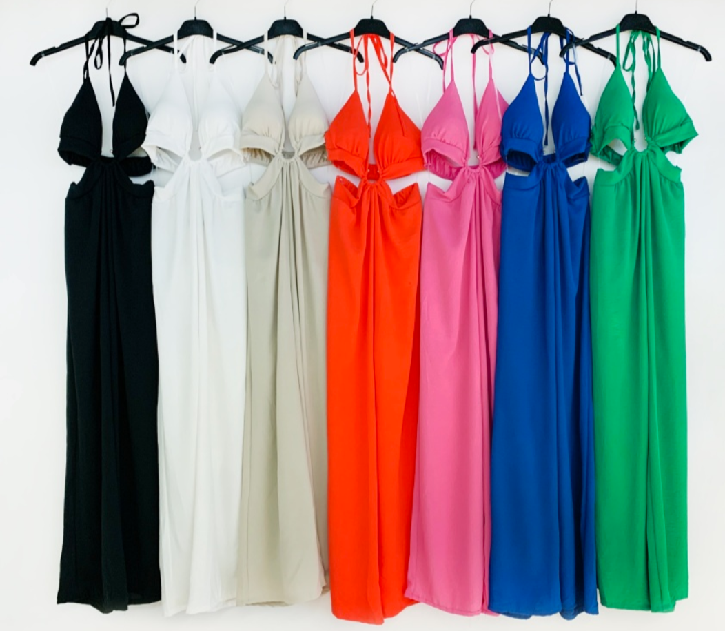 Mono elástico con goma en la cintura y en la parte de la espalda. Lleva copas incorporadas.