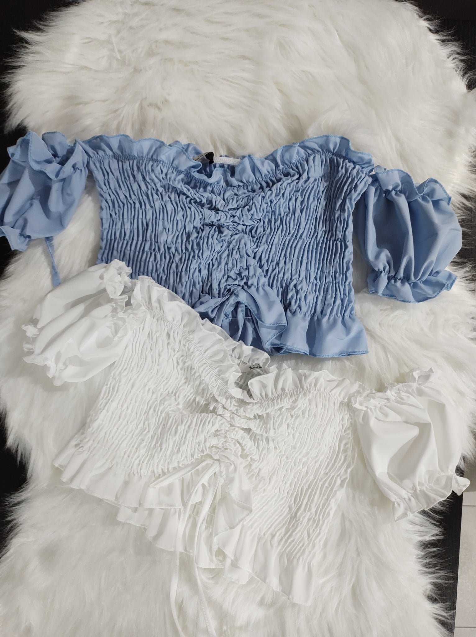 Top elástico de nido de abeja fruncido en la parte delantera para regular el largo del top. No lleva copas y las mangas van cosidas al top con unas puntadas.