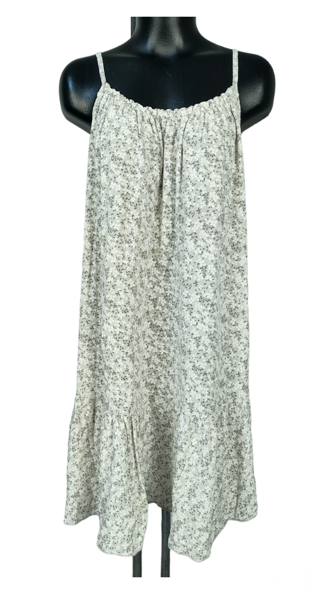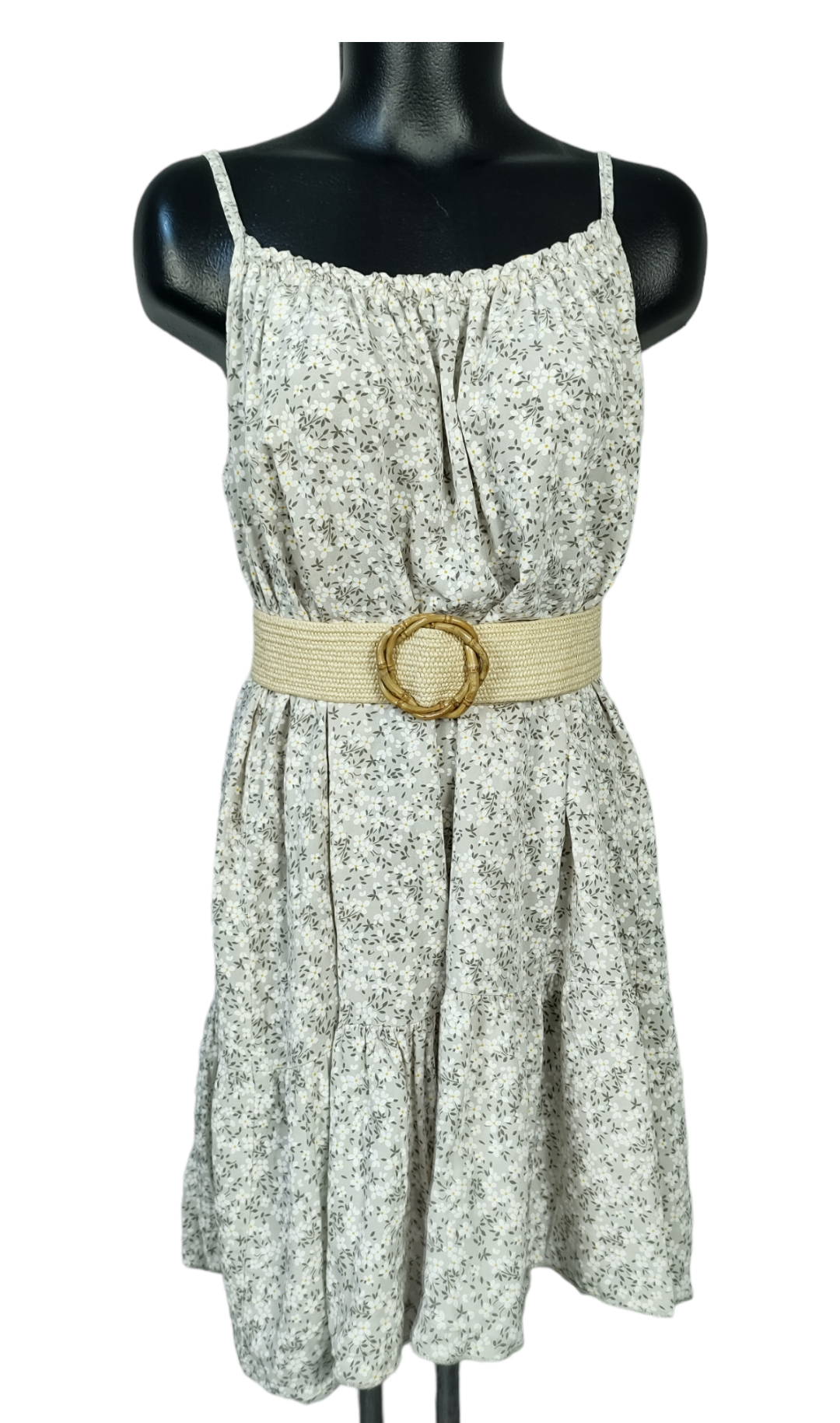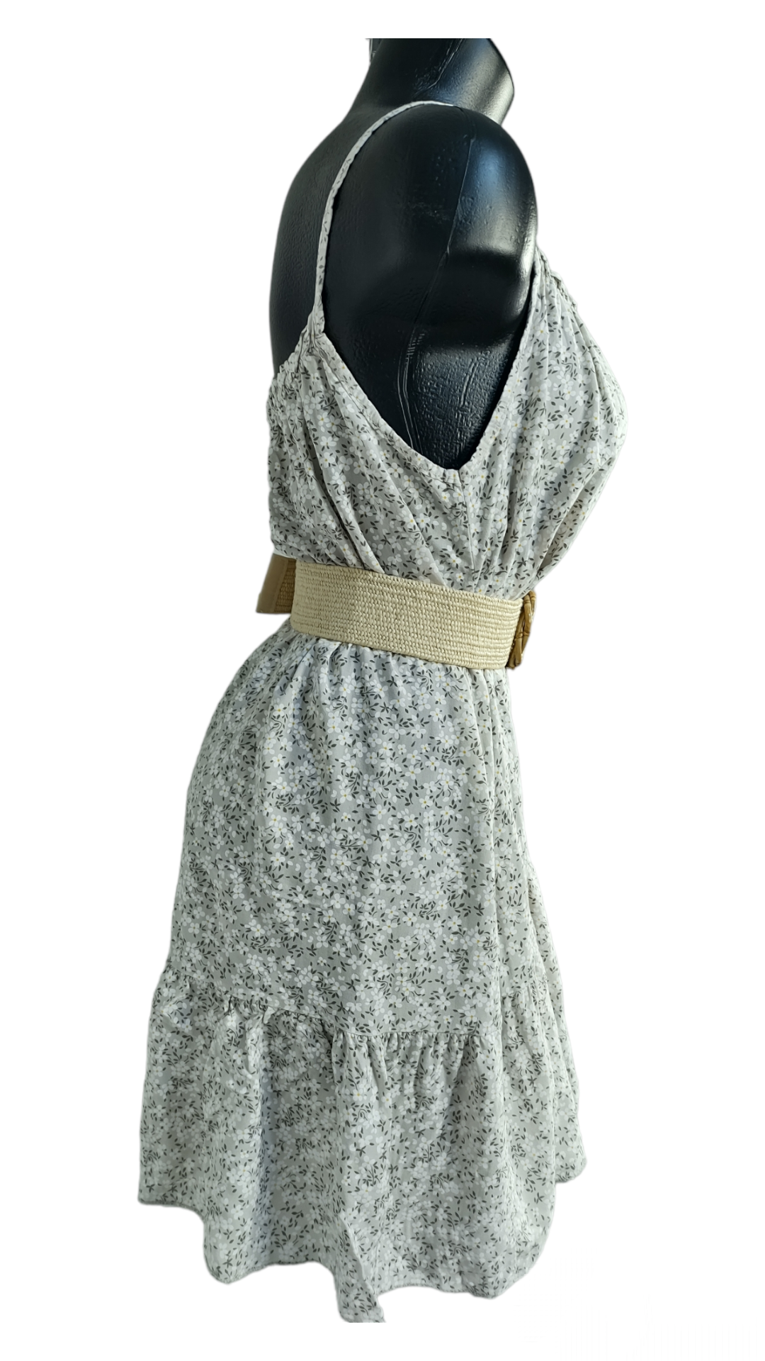 Vestido ancho de tirantes no regulables. No incluye cinturón. La parte de atrás es un poco más largo que la parte delantera. Es muy cómodo y fresquito.