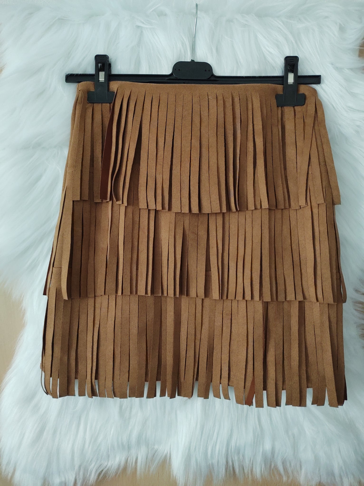 Talla única S a MFalda elástica de antelina con flecos en la parte delantera y goma en la cintura.Talla habitual de la modelo:M/ 38 ( parte de abajo)S/36 (parte de arriba)Altura: 162 cm