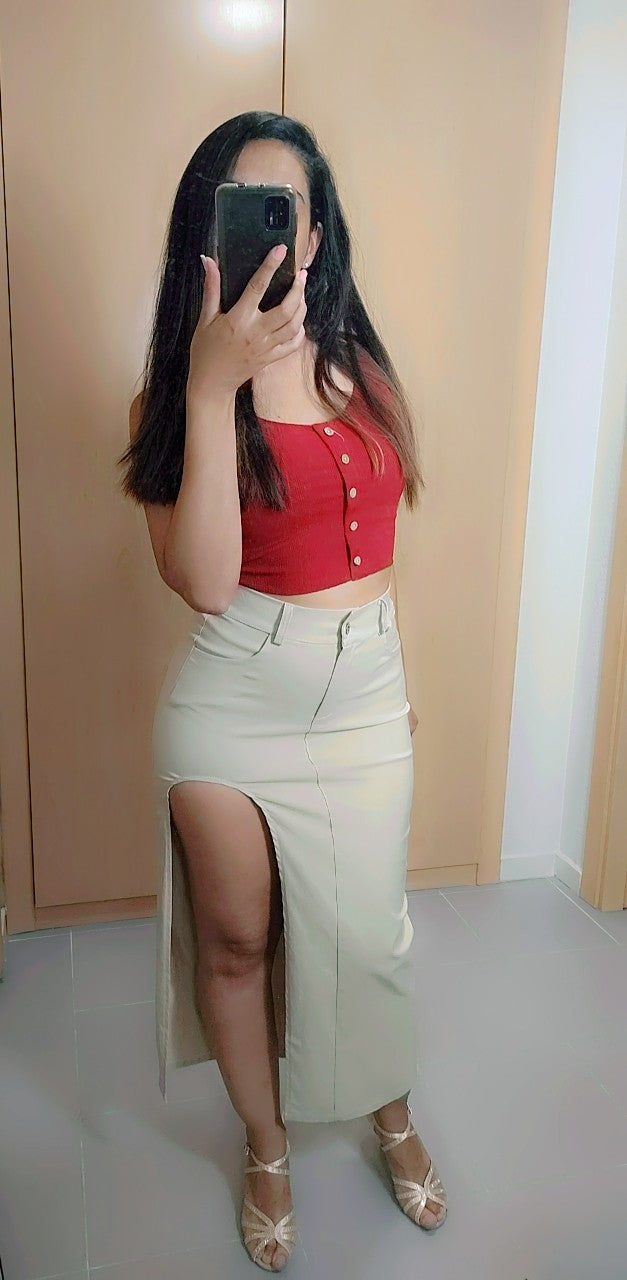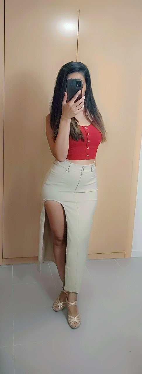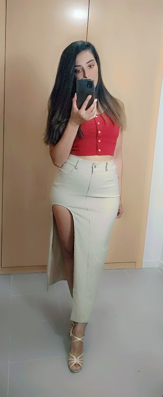 Talla única M a L (38-42)Falda elástica con goma en la cintura y bolsillos frontales. Abertura lateral.